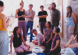 (写真:ワークショップ最後の日のレッスン風景 基本の練習より始め漢字の説明に移りデフォルメについて説明している)